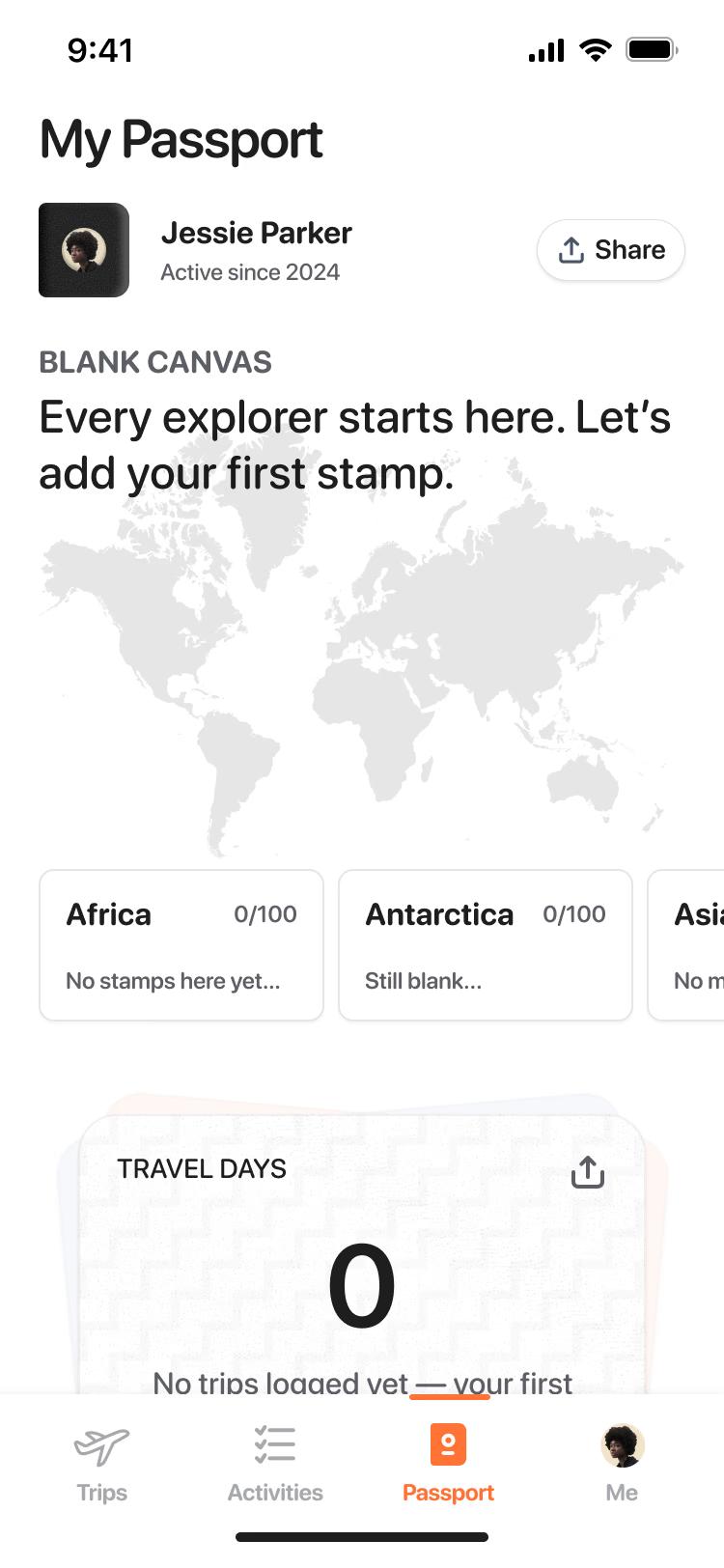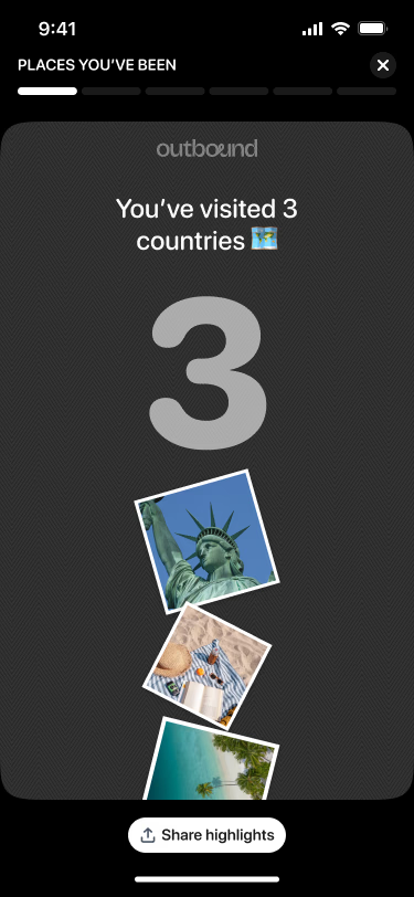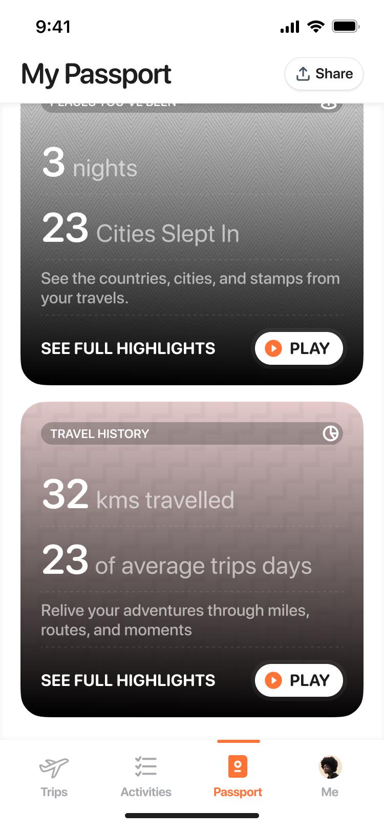 See highlights from each trip with cities visited, days away, and personal stats. Relive your journeys and share them with friends.