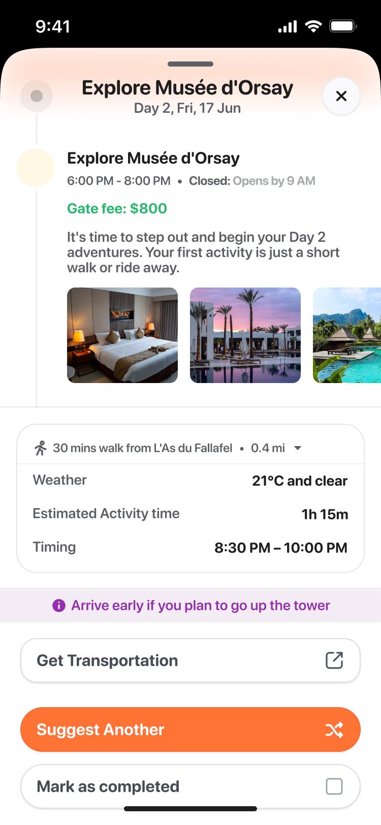See your trip unfold in a clear timeline with directions, times, and activities that flow naturally.